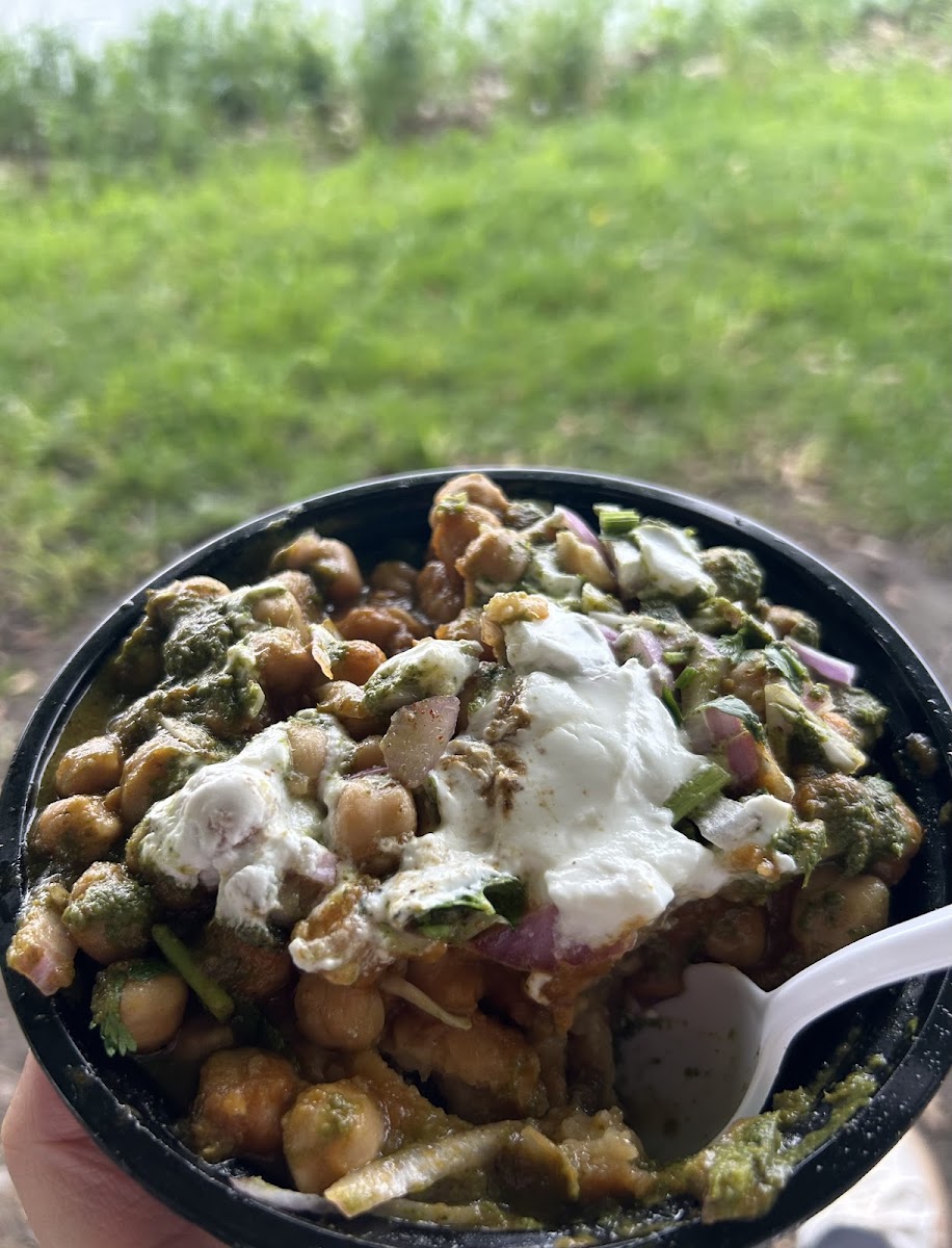 Includes base of chana masala and samosa, as well as yogurt, onions, and additional spices.