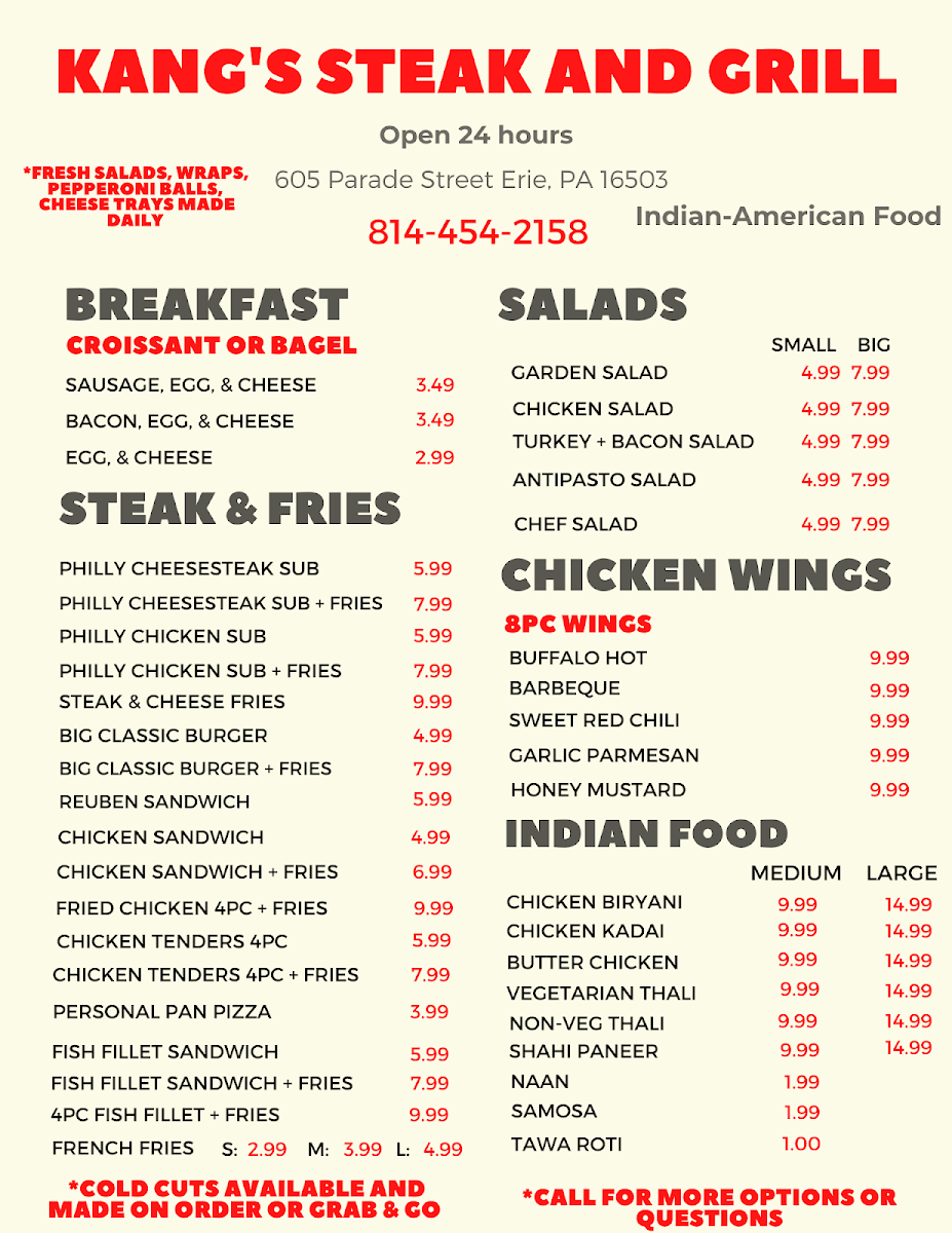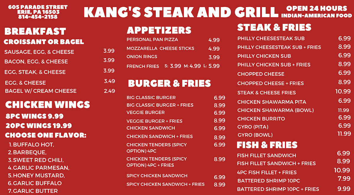 Kang's Steak And Grill Menu offers a delightful blend of flavors that will satisfy any craving. Whether you're in the mood for a quick snack, a hearty meal, or a comforting breakfast, this menu has something for everyone. For those who love classic American flavors, the combos like the Philly Chicken Sub with fries and a refreshing 16oz fountain soda are a great option. If you're craving something indulgent, the Big Classic Burger served with fries and a soda is sure to hit the spot. The chicken wings, available in both 8 and 20-piece servings, are perfect for those looking to share or enjoy a solo snack.